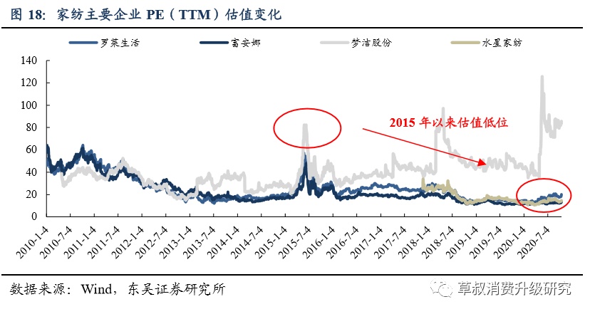 估值处于近五年较低水平,参考Q4业绩预期估值水平有望抬升。主要家纺企业估值自2015年年中以来不断回落,目前除梦洁股份外均在20X及以下,处于偏低水平,参考Q4较好的业绩预期估值有望抬升。