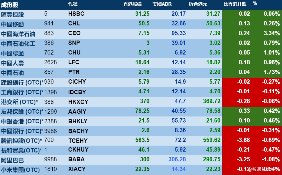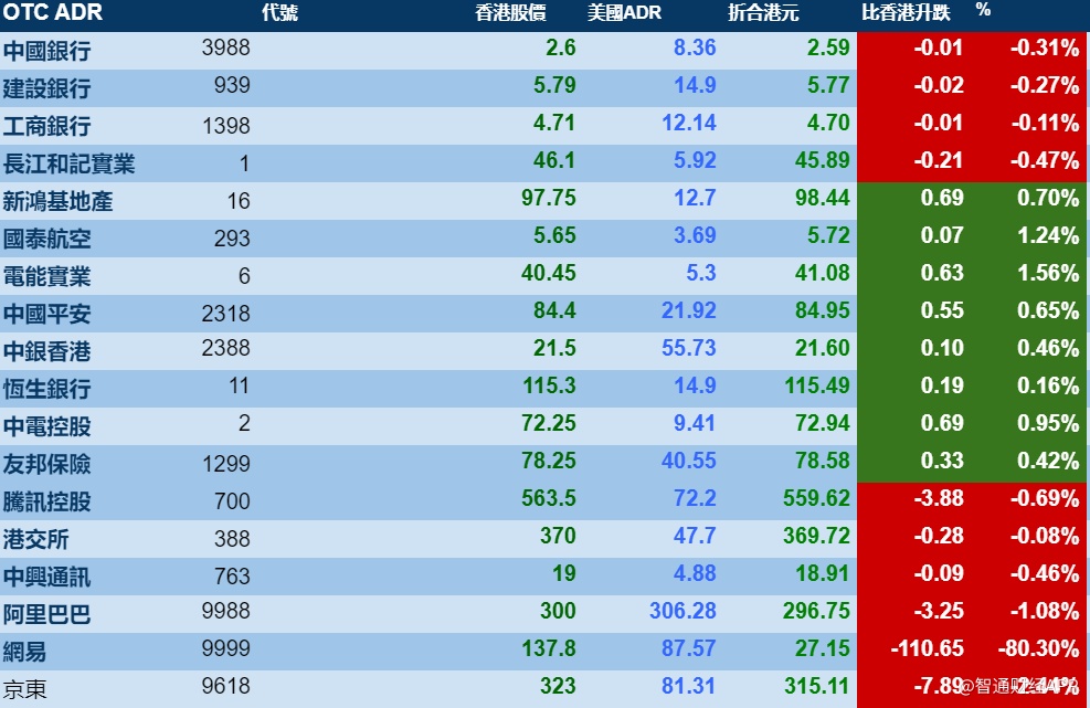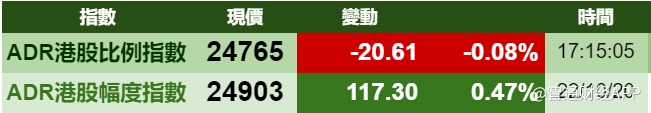 智通财经APP获悉,周四美股三大指数上涨,港股ADR指数却下跌,按比例计算,收报24765点,跌20.61点或0.08%。