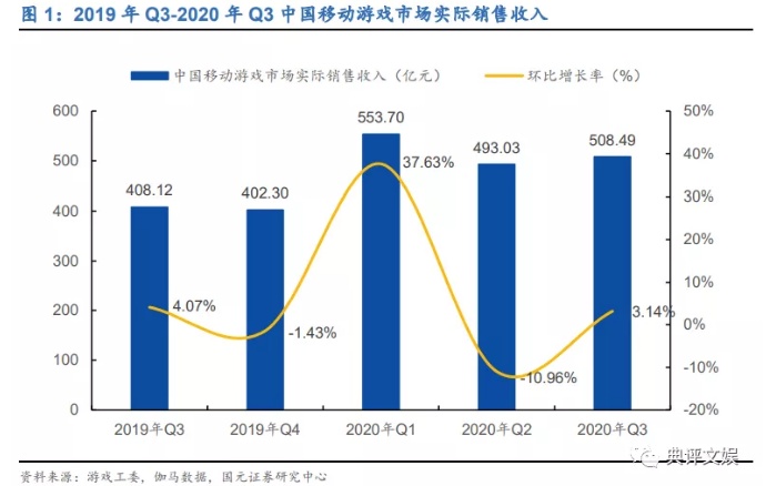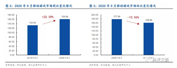 (1)行业:2020Q3移动游戏市场实际收入508.49亿元,环比增长3.14%,同比增长约24.59%。9月移动游戏行业市场规模达到159.95亿元,同比增长20.59%,环比下降10.06%,流水同比增长率超去年同期。