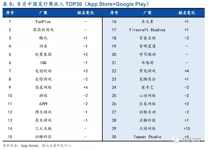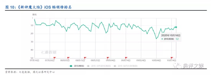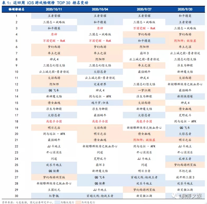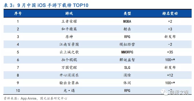 国内产品方面,《阴阳师:妖怪屋》首发,《率土之滨》开启五周年庆典活动。9月17日,基于阴阳师IP世界观衍生出来的养成休闲游戏《阴阳师:妖怪屋》正式上线,目前该游戏已位列国内iOS畅销榜第90名;得益于品牌的协同效应,《阴阳师》的流水排名也在《阴阳师:妖怪屋》上线后也一度大幅提升。受益于五周年庆典活动的营销预热,《率土之滨》的流水排名较9月底有明显提升,目前该游戏已位列iOS畅销榜第10名。