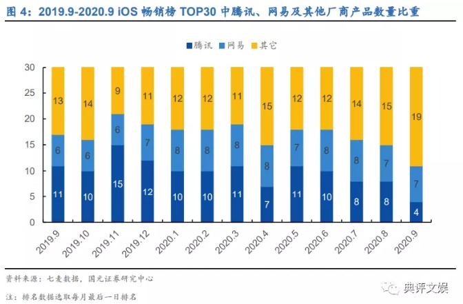 9月非腾讯、网易的产品进入TOP30的数量继续增加。2020年9月,iOS畅销榜TOP30中非腾讯、网易的产品达到19款,买量模式下更多游戏厂商尝试自研自发,为市场提供优势产品。