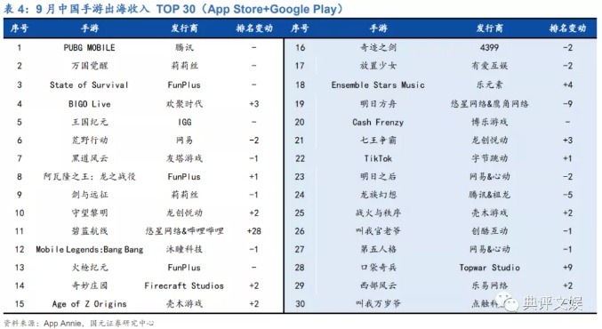 9月出海产品收入排名方面,腾讯《PUBGMOBILE》已连续6个月位列出海收入排行榜第1;得益于成功的上线三周年运营活动,二次元题材RPG《碧蓝航线》在日本地区的收入环比增长345%,促使《碧蓝航线》的收入排名较上月提高28位进而位列榜单第11名;乐元素的二次元女性向模拟游戏《EnsembleStars Music》在日本市场的收入亦在稳步提高,该游戏收入排名上升4位,位列榜单第18名;此外,Topwar Studio休闲策略游戏《口袋奇兵》在美国市场表现出色,排名较上月提高9位,最终位列出海收入榜第28名。