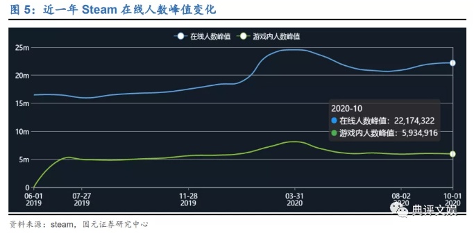 端游方面,2020年10月steam平台的在线人数峰值升至2217.43万,环比9月上升1.17%;和去年同期相比,同比增长32.17%,大幅高于上年10月1677.77万的在线人数峰值水平。