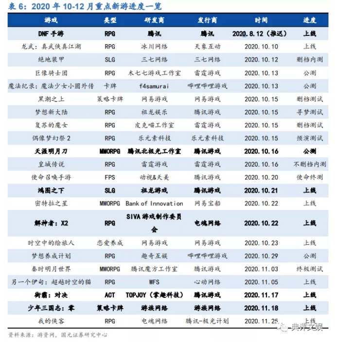 多款重点产品将在10月中旬之后陆续进入测试阶段。具体来看,三七网络自研的SLG手游《绝地装甲》10月12日开启删档内测,雷霆游戏代理的RPG游戏《巨像骑士团》和哔哩哔哩游戏代理的卡牌游戏《魔法纪录:魔法少女小圆外传》同时在10月13日开展公测,网易游戏自研的策略卡牌游戏《黑潮之上》在10月15日开启删档内测,动视、腾讯合作研发的FPS手游大作《使命召唤手游》也将于10月20日开始开启使命终测,由腾讯魔方工作室研发、基于知名国漫IP《秦时明月》创作的MMORPG手游大作《秦时明月世界》则将于11月3日开启终极测试。
