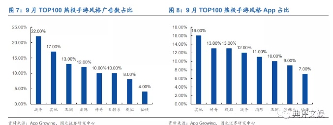 从投放游戏题材来看,广告投放数TOP100中战争以及三国题材投放较为强势。得益于莉莉丝《万国觉醒》等多款策略游戏的海量广告投放,战争类手游广告占广告投放数TOP100的比重达22.00%;在App数量方面,其他(网赚、休闲手游)、传奇、模拟、战争、消除类手游款数较多。