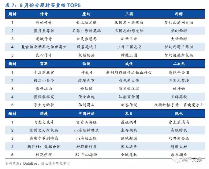 大厂头部产品持续占据三国、西游题材买量市场,中小厂商新游戏主攻细分领域。9月份分题材游戏买量榜单TOP5中,三国、西游、传奇、武侠等主流题材头部买量产品榜单变动较小,三国题材头部游戏的买量市场基本已被腾讯、阿里、游族等大厂占据,西游品类的买量市场则由网易主导。新游戏则在二次元、动漫、中国神话等细分领域题材的买量市场上取得突破,有多达80%的买量榜TOP5产品是新上榜的游戏,且这些产品多来自于中小厂商。在大厂占据主流题材产品买量榜单之际,快速占领细分游戏品类的买量市场已成为中小厂商行之有效的竞争策略。