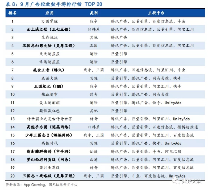 产品投放排行榜方面,本月新上榜游戏数量众多,战争类手游投放势头强劲。9月手游热投榜TOP20中,战争类手游有莉莉丝《万国觉醒》、腾讯《乱世王者》、IGG《王国纪元》、游族网络《少年三国志2》以及阿里旗下灵犀互娱的《三国志·战略版》5款游戏进入榜单,占上榜产品的比重达四分之一。其中,在榜单中位列第1的是莉莉丝的战争类新游《万国觉醒》,投放量约为第二名的2倍;三七互娱发行的MMO手游《云上城之歌》本月的推广力度也继续提升,位列9月榜单的第2名。此外,恺英网络的日韩系新游《高能手办团》广告投放力度也较为可观,位列9月手游热投榜第14名;另外,本月多款消除类手游和传奇类手游也加大了买量力度,消除类方面,《天天消星星》榜单排名环比上月提升8名,进而位列9月排行榜第5名,《幸运消星星》新进入榜单并名列第6;传奇类方面,《热血都市》、《传世霸业之复古传奇世界》以及《蓝月至尊版》分别位列手游热投榜第10名、第13名和第19名。