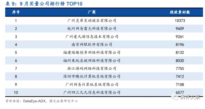 9月投放厂商排行榜方面,阿里游戏、网易游戏占据前两位。9月买量公司主体榜单的TOP3为广州灵犀互动娱乐有限公司、杭州网易雷火科技有限公司以及广州爱九游信息技术有限公司,三家公司当月的素材投放量分别为10373组、9609组和9261组;阿里旗下的灵犀互娱,其主投游戏为《三国志幻想大陆》、《三国志·战略版》两款三国题材手游,在买量榜单上紧随阿里游戏之后的网易公司,其主投产品则是《梦幻西游》、《大话西游》和《阴阳师:妖怪屋》;爱九游的主投游戏亦是《三国志·战略版》和《三国志幻想大陆》两款三国题材游戏。