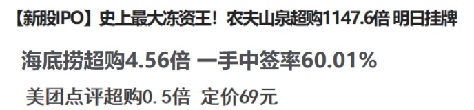 若是放在两年前,海底捞(06862)的创始人张勇先生恐怕做梦也想不到,同样是集资一百亿,市值过千亿,同样是知名品牌,2018年海底捞(09633)招股时公开发售才超购不足5倍,而农夫山泉能超购1147倍。不过还有更惨的,今年的科网股龙头美团点评(03690),当年上市时公开发售只超额了0.5倍。