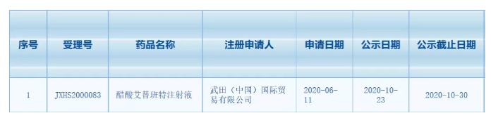 CDE官网信息显示,武田于今年6月首次在中国递交醋酸艾替班特注射液上市申请并获受理。此前,已有豪森药业按3.1类提交醋酸艾替班特仿制药的临床试验申请,和圣诺生物按照3类提交艾替班特仿制药的上市申请。
