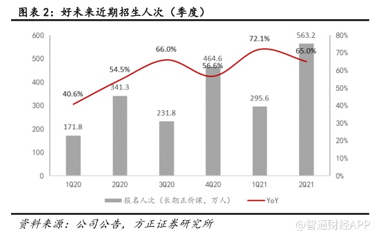 2、FY21Q2长期正价课报名人次为563.2万(YoY+65%)。截至FY21Q2,教学中心共936个,覆盖城市91个。