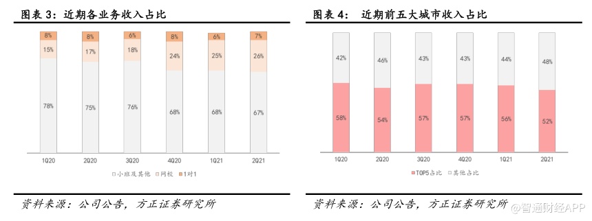线下中心受卫生事件影响环比不变,未来仍将加速扩张:截至FY21Q2末,公司开设教学中心共936个,同比增加178个,环比不变;其中,学而思培优小班学习中心716个,摩比和励步小班学习中心91个,智康学习中心129个。截至FY21Q2末,覆盖城市91个(中国90个,美国1个),同比增加22个,环比增加1个(咸阳)。