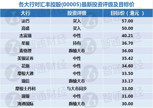 二、各大行对汇丰控股(00005)最新投资评级及目标价