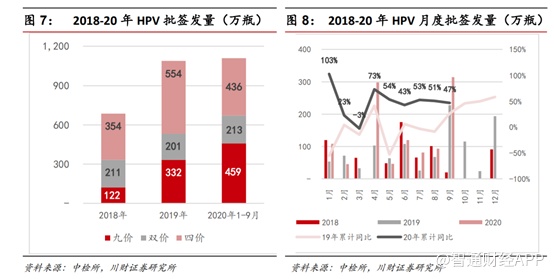 尽管HPV是重磅产品,但是国内万泰生物(603392)的2价HPV在2019年底就已上市,但是从疫苗的批签发数据来看,2价HPV的上市并没有影响默沙东9价HPV的销量。数据显示,2020年前三季度,HPV累计批签发量1108万瓶,同比增长41%。其中,2价HPV获批213万瓶,4价HPV获批436万瓶,9价HPV获批459万瓶。