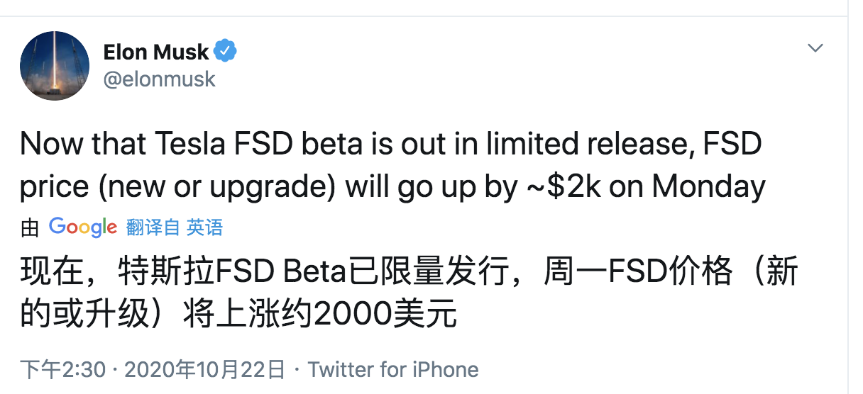 FSD beta版发布,下周一涨价2000美元,截图自马斯克推特