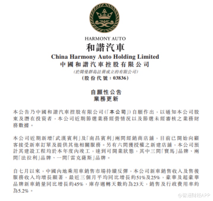 智通财经APP观察到,早在今年8月26日,华泰金融便发布研报表示,考虑到宏观经济放缓导致汽车需求走软,预计和谐汽车将优先改善经营效率、降低库存周转天数和提高客户忠诚度。而通过这些举措,和谐的经销业务有望实现持续的盈利增长。