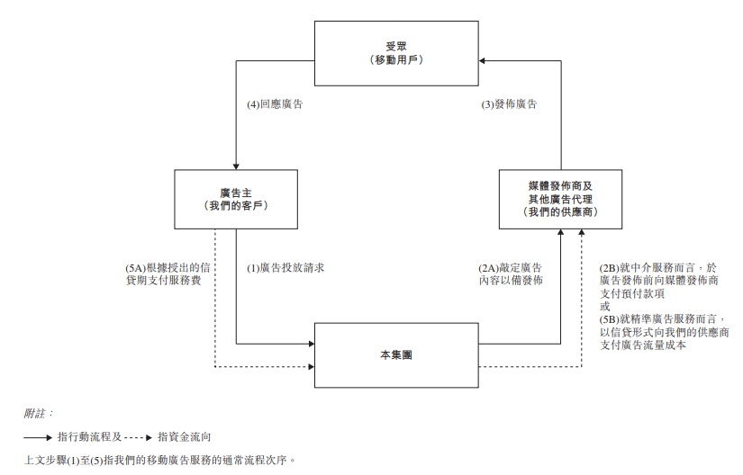 作为一家移动广告公司,辉煌明天科技可以为客户提供广泛的供应商网络以投放广告并提供服务链相关经验和专业知识,协助客户实现其广告目标。目标受众将通过手机及平板计算机等移动设备上的应用程序接收广告。目前,该公司可以提供两类移动广告服务,即中介服务及精准广告服务。