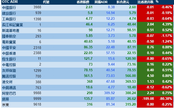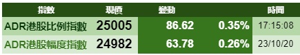 智通财经APP获悉,周五美股三大指数仅道指微跌,港股ADR指数小幅上涨,按比例计算,收报25005点,升86.62点或0.35%。
