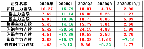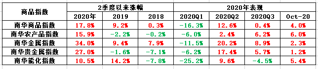 2020年2季度以来,随着国内经济的逐步企稳,大宗商品市场迎来了一波强势反弹。以南华商品综合收益率来看,2020年4月1日至10月22日,大宗商品实现了17.8%的涨幅,好于2019年和2018年同期的9.2%和0.3%。