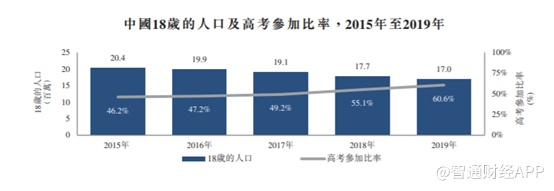 智通财经APP观察到,中国18岁人口逐渐趋于稳定,2019年达到1700万,而高考参加比率不断提升,2019年为60.6%,参加高考人数达到1030万人。鉴于高考人数稳定增加,同时市场上对于优质教育、综合教育的需求增加,使得K12课外辅导的需求持续提升。