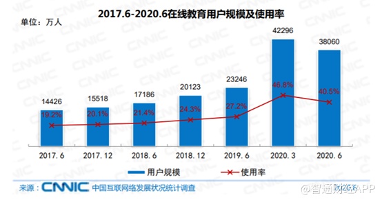 线上教育是未来行业竞争的重要方面,智通财经APP了解到,截至2020年6月,我国在线教育用户规模达到3.81亿,较2019年同期增加63.7%,占网民整体的40.5%,手机在线教育用户规模达到3.77亿,较2019年同期增加89%,占手机网民的40.4%。