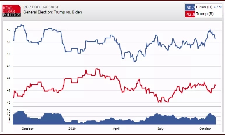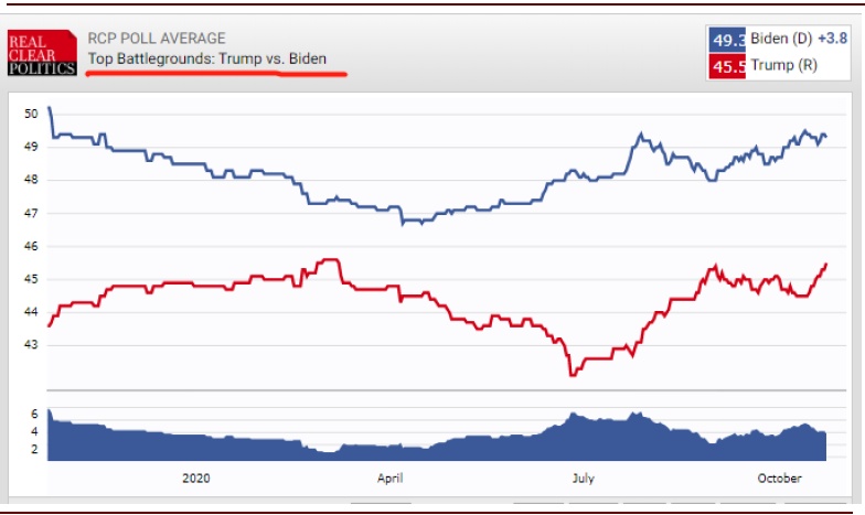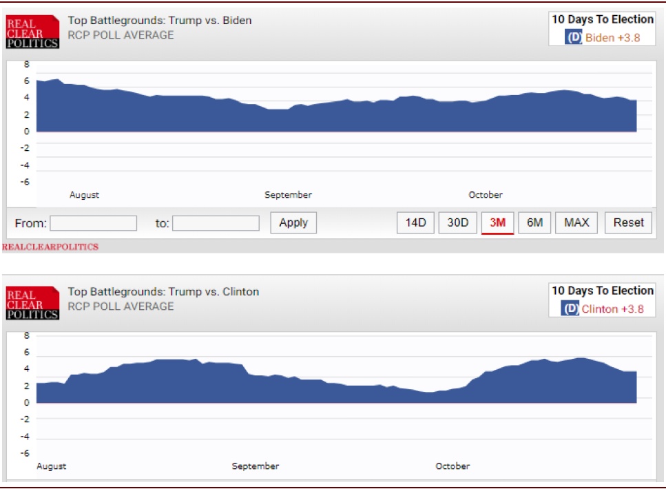 根据RCP汇总的最新民调数据,尽管近期有所收敛,但特朗普与拜登的民调差距依然较大,全国民调落后7.9%、博彩赔率落后30%,但关键摇摆州差距缩窄至3.8%。作为对照,在2016年距大选投票日同一时间,希拉里全国民调领先3.8%,而关键州领先3.8%,与当前水平已经持平。