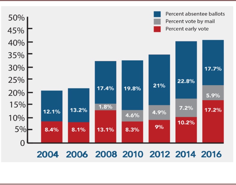 图表: 2016年,提前投票和邮寄选票的占比分别为17.2%和5.9%
