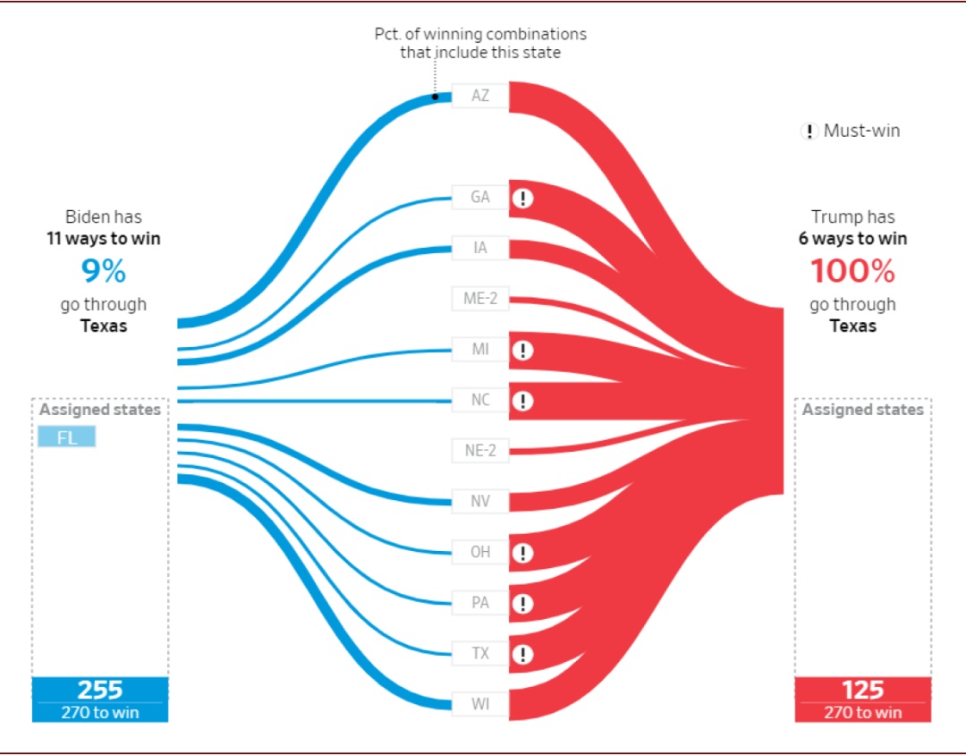 图表: 若拜登赢得佛罗里达,那么特朗普只剩6种方式赢得大选,且必须要拿下得克萨斯州