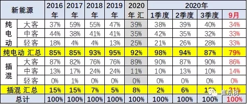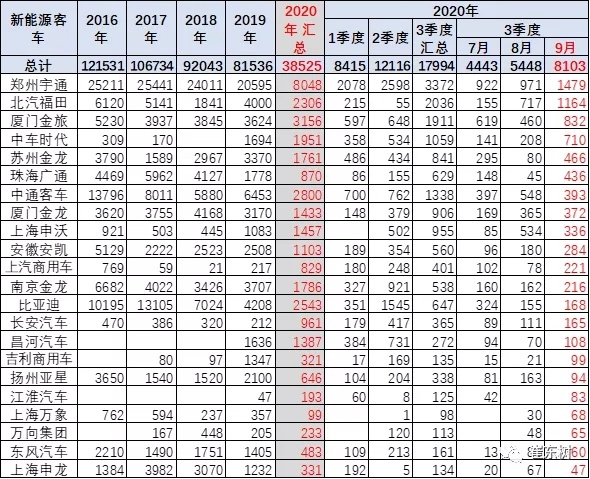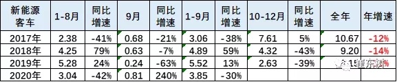2020年年初新能源车增长总体很低迷,其中新能源客车20年1-9月3.85万台,同比下降30%,9月0.81万,增速240%,增长表现改善。