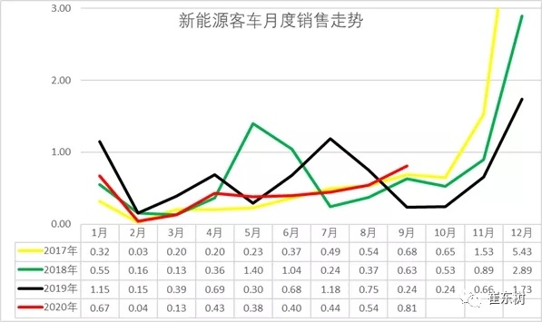 在中国客车市场全年的销量中,新能源占据了举足轻重的作用,改变了中国客车市场的销售规律,每年退坡时新能源客车销售高峰对全年销售贡献度极高。