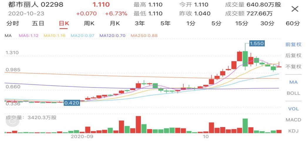 值得注意的是,9月1日至10月23日收盘,都市丽人股价涨幅高达152%。