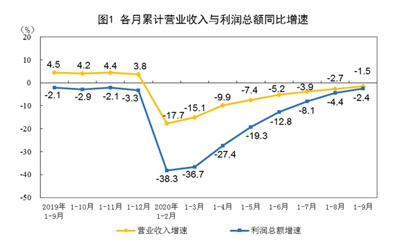 1-9月份,全国规模以上工业企业实现利润总额43665.0亿元,同比下降2.4%(按可比口径计算,详见附注二),降幅比1-8月份收窄2.0个百分点。