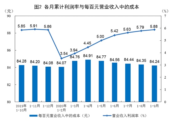 1-9月份,规模以上工业企业每百元营业收入中的成本为84.24元,同比增加0.07元;每百元营业收入中的费用为8.94元,同比增加0.15元。