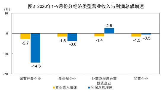 1-9月份,规模以上工业企业中,国有控股企业实现利润总额11303.1亿元,同比下降14.3%;股份制企业实现利润总额30681.1亿元,下降3.6%;外商及港澳台商投资企业实现利润总额12443.0亿元,增长2.6%;私营企业实现利润总额12748.3亿元,下降0.5%。