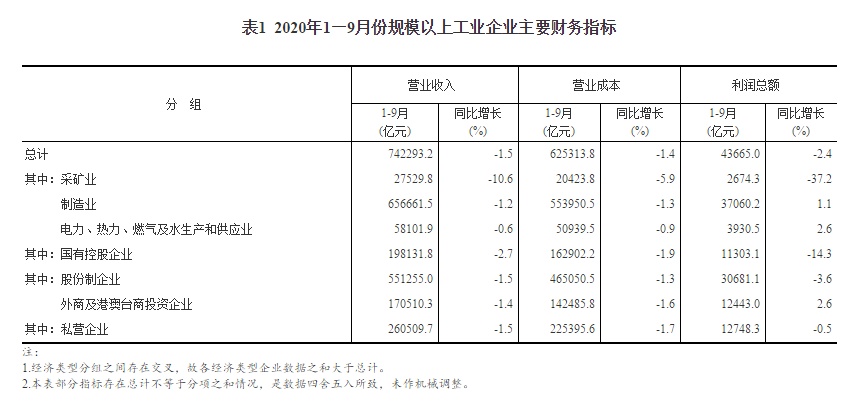 智通财经APP获悉,10月27日,国家统计局发布2020年1-9月份全国规模以上工业企业数据。具体如下: