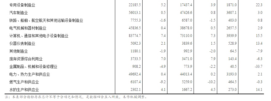 1-9月份,在41个工业大类行业中,21个行业利润总额同比增加,20个行业减少。主要行业利润情况如下:专用设备制造业增长22.3%,农副食品加工业增长16.7%,计算机、通信和其他电子设备制造业增长15.5%,通用设备制造业增长10.7%,纺织业增长4.8%,汽车制造业增长3.0%,电气机械和器材制造业增长2.9%,有色金属冶炼和压延加工业增长2.1%,电力、热力生产和供应业增长2.1%;石油和天然气开采业下降70.2%,石油、煤炭及其他燃料加工业下降66.2%,煤炭开采和洗选业下降30.1%,黑色金属冶炼和压延加工业下降18.7%,化学原料和化学制品制造业下降17.7%,非金属矿物制品业下降1.3%。