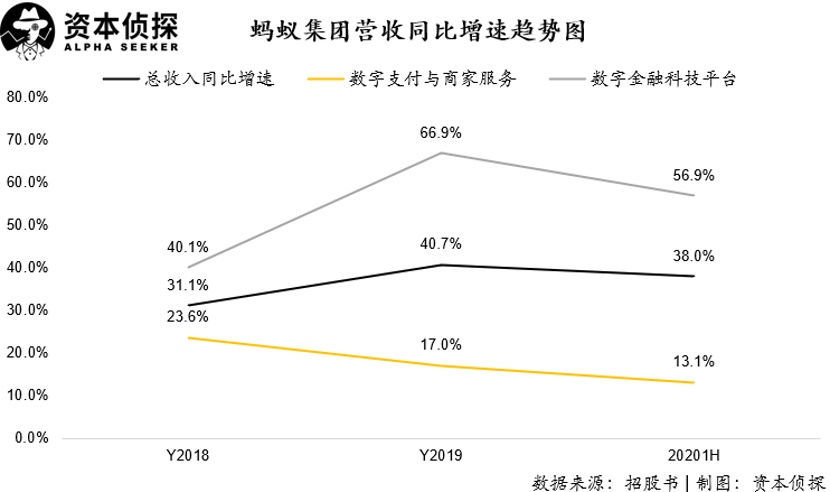 可以看到,在报告期内2018、2019及2020上半年,蚂蚁集团支付及商家服务收入同比增速分别为23.6%、17%以及13.1%,呈现快速下降趋势。而公司的数字金融科技业务2018、2019及2020年上半年则均呈现快速增长,同比涨幅分别高达40.1%、66.9%以及56.9%。