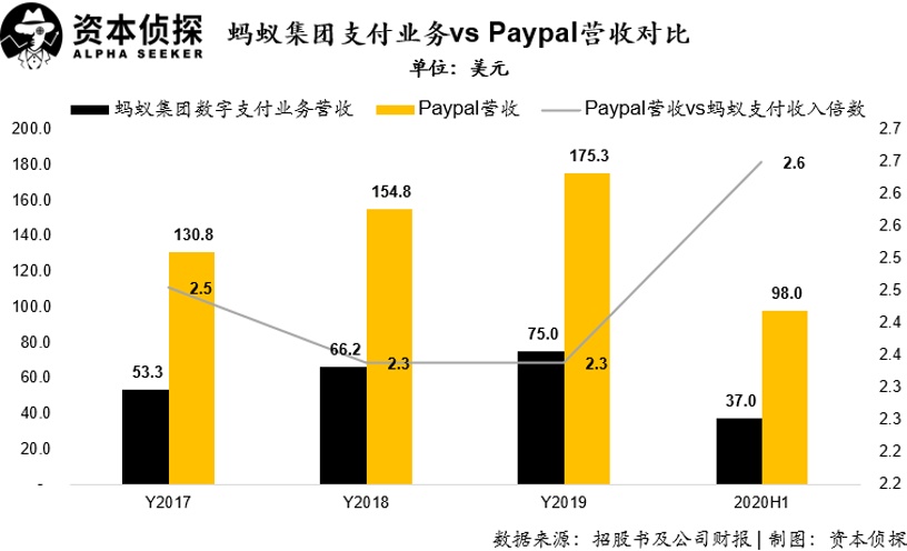 以目前Paypal在美股2382亿美元的二级市场市值(截止上周最后一个交易日后市值),在考虑收入增速及盈利性的同时,按照2.3倍较低倍数计算蚂蚁集团支付业务估值,蚂蚁集团第三方支付业务估值将在1000亿美元上下。