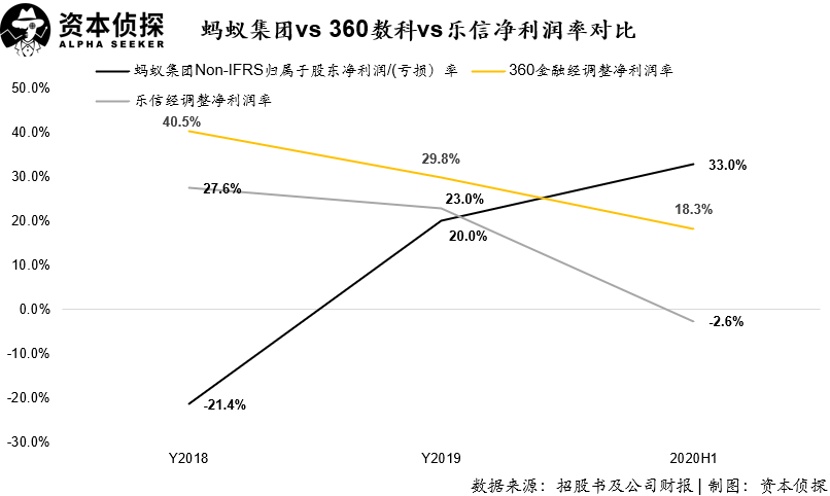 由于蚂蚁集团在招股书中并未单独披露数字金融科技业务利润情况,因此取集团整体利润率33%(高于360数科和乐信利润水平),同时按照蚂蚁集团金融科技业务上半年56.9%的收入同比增速预估2020年全年收入将达到1064亿元(2019年收入677.8亿*156.9%=1064亿)。