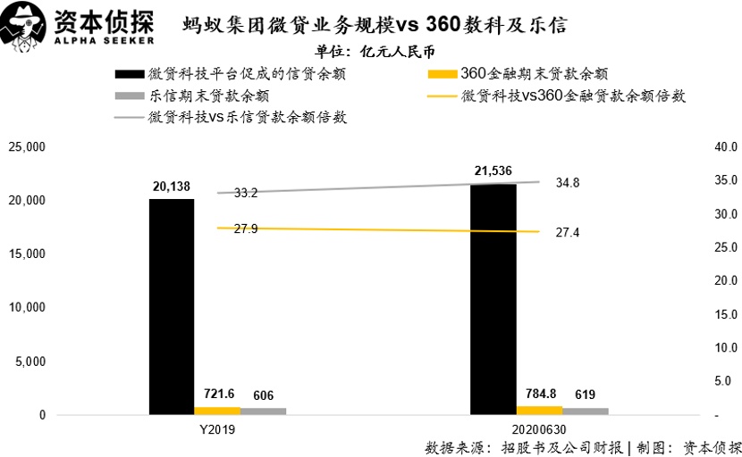 从另一个角度去验证,截止6月末,蚂蚁集团微贷科技平台信贷余额为21536万亿元人民币,是360数科6月末信贷余额的27.4倍,是乐信信贷余额的34.5倍。