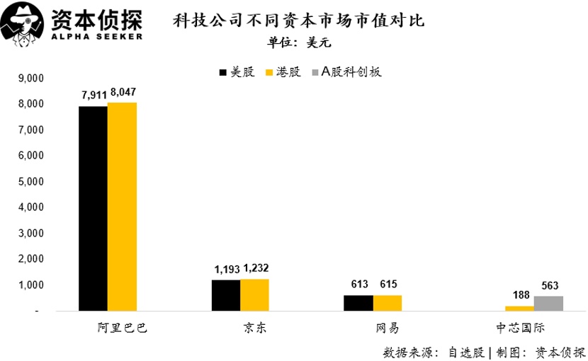 不过,同样是在美股及香港两地上市的公司,无论是阿里集团,还是今年回归香港的京东(09618)和网易(09999),由于估值体系接近,投资者组成接近,因此并不存在较大的市值差异。
