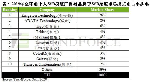根据2019年全球SSD模组厂自有品牌在渠道市场出货排名,受惠于NAND Flash价格急速下滑,2019年全球SSD出货量约有1亿3100万台水平,较2018年成长近60%,普及度进一步提升,而金士顿(Kingston)、威刚(ADATA)与金泰克(Tigo)仍位居前三大模组厂品牌。