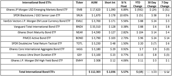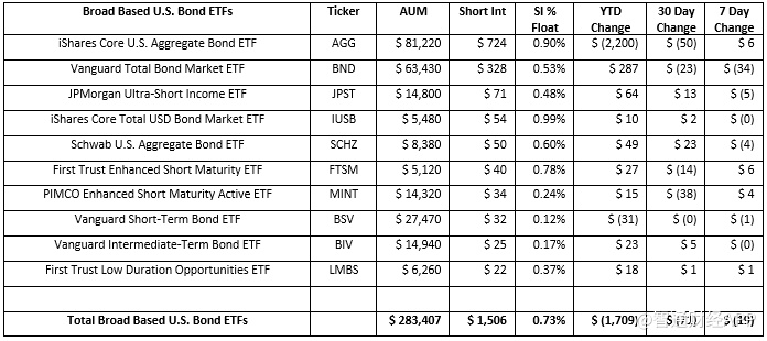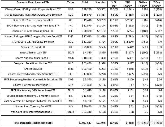 今年以来,固定收益ETF的空头敞口减少了4.88亿美元,仅在过去一周就减少了3.81亿美元。以下是空头头寸最多的20只美国固定收益ETF。