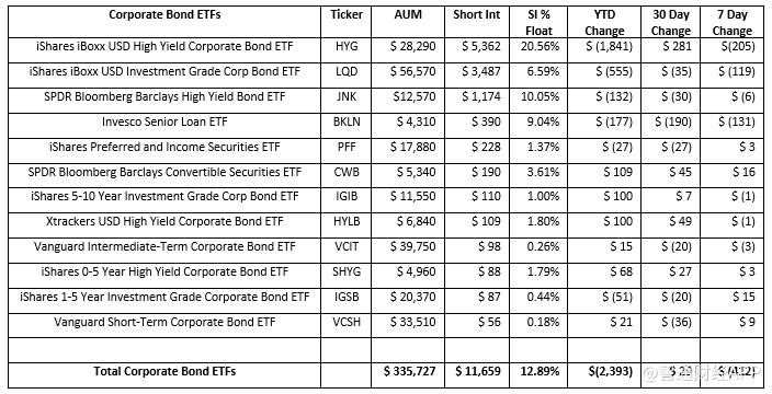 智通财经APP获悉,根据ETF.com的数据,目前有438只固定收益ETF在进行交易,资产规模为1.05万亿美元。这些ETF的空头头寸达219.5亿美元,其中超过一半的卖空交易发生在公司债券ETF上。