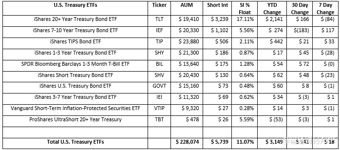 美国国债ETF的卖空交易高度集中在三只ETF上。iShares安硕20年期以上美国国债(TLT.US)、iShares Barclays 7-10年ETF(IEF.US)和iShares Barclays(TIP.US)占美国国债ETF板块所有空头头寸的84%。因预期利率和通胀将上升,空头似乎正在做空较长期国债和通胀保值债券。