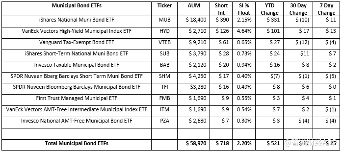 市政债券ETF的空头头寸在2020年增加了264%,原因是受到公共卫生事件的不利影响,空头预期此类ETF的价格将疲软。美国市政债ETF-iShares(MUB.US)是管理资产规模最大的ETF,也是空头头寸最大的ETF,是市场多头和空头的首选。