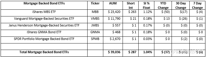 固定收益ETF中空头头寸最小的一类ETF是抵押贷款支持ETF。较低的利率和强劲的房地产市场是这一板块的积极因素,美国按揭抵押债ETF-iShares(MBB.US)今年上涨了3.9%。MBB的空头敞口相对稳定。