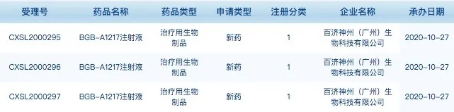 智通财经APP获悉, 10 月 27 日,CDE官网更新显示,百济神州(06160)提交的1类新药 BGB-A1217 注射液三项临床研究申请已获受理。
