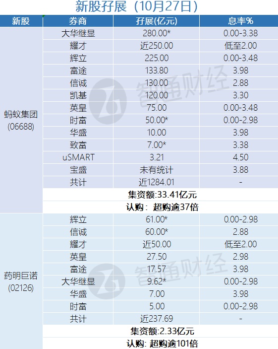 智通财经APP获悉,蚂蚁集团(06688)、药明巨诺-B(02126)正在招股中。截至10月27日,辉立 、耀才、信诚等券商合计分别为其借出近1284.01亿港元、近237.69亿港元。其中,蚂蚁集团超购逾37倍,药明巨诺超购逾101倍。