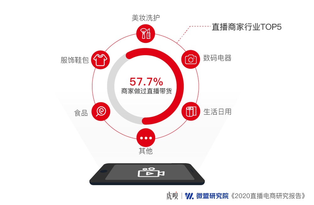 根据虎嗅联合微盟研究院问卷调查,超过七成的用户有过直播购物的经历,认为通过直播可以对商品有更直观的了解,且价格也相对实惠,能够激发购买欲。超过一半的用户每个月通过直播购物一到两次。另有针对商家的调查问卷显示,57.7%的商家做过直播带货,其中,服饰鞋包、美妆洗护、食品、生活日用、数码电器五大行业是直播带货的热门行业。